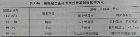 2.混凝土基礎(chǔ)的質(zhì)量檢查,可用錘敲擊的方法判斷基礎(chǔ)強度,判斷方法見表4-16.